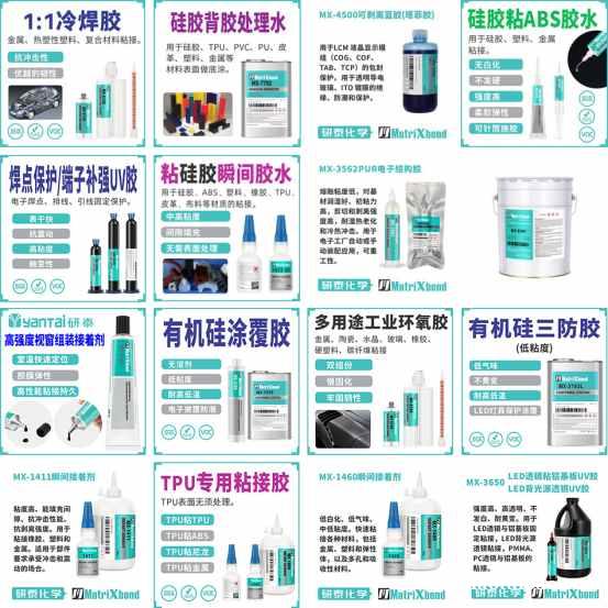 产品介绍:针对电子、电器应用的电子接着剂、电子密封胶、弹性接着剂、电子三防漆、有机硅披覆胶、电子UV接着剂等;针对PP、PE、PC、PVC等难粘塑料材质的溶剂型接着剂;针对高温工况特殊研发的耐高温胶粘剂;针对电机应用行业研发的磁钢、磁瓦组装结构胶;针对新能源领域研发的弹性结构密封胶;针对工业装配快速要求研发的快干型接着剂;针对新合成材料研发的钢性与柔性复膜胶;针对难粘接的金属、PP、PE、硅胶、硅橡胶、铝合金等材料研发的低能表面处理剂等。