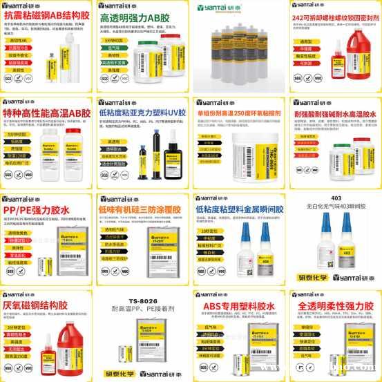公司所有产品,都是科研组听取广大客户反映的材料粘接问题与行业应用要求而进行研发生产的。主要产品系列有:针对电子、电器应用的电子接着剂、电子密封胶、弹性接着剂、电子三防漆、有机硅披覆胶、电子UV接着剂等;针对PP、PE、PC、PVC等难粘塑料材质的溶剂型接着剂;针对高温工况特殊研发的耐高温胶粘剂;针对电机应用行业研发的磁钢、磁瓦组装结构胶;针对新能源领域研发的弹性结构密封胶;针对工业装配快速要求研发的快干型接着剂;针对新合成材料研发的钢性与柔性复膜胶;针对难粘接的金属、PP、PE、硅胶、硅橡胶、铝合金等材料研发的低能表面处理剂等。